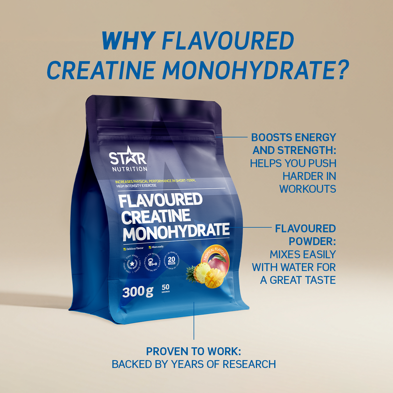 Star Nutritions Flavoured Creatine Monohydrate leverer kreatinmonohydrat i pulverform med lækre smagsvarianter, som gør det nemt at få sin daglige dosis.